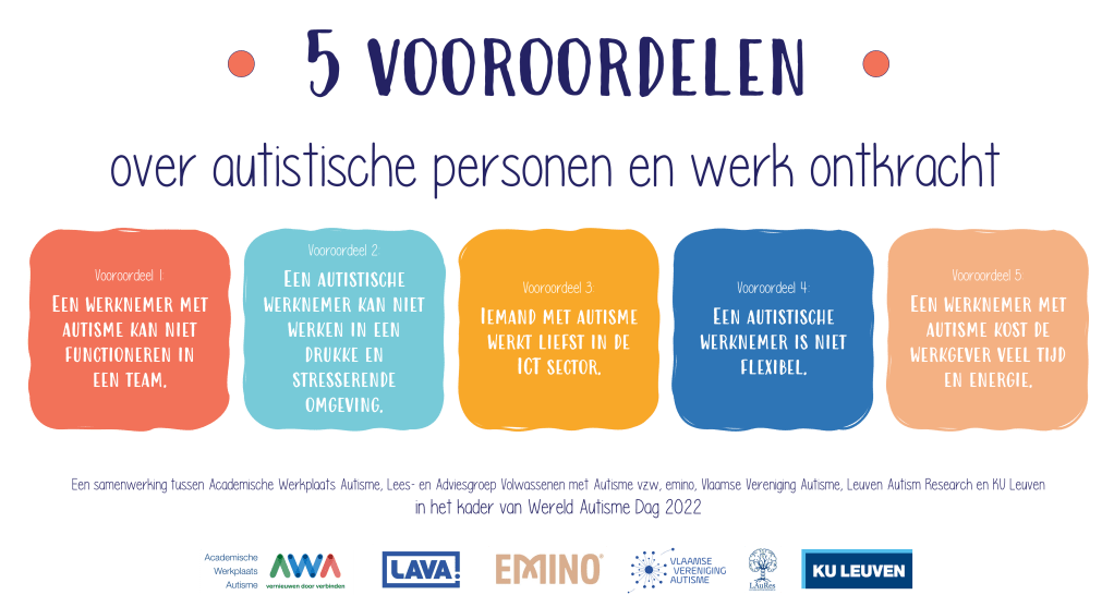 In het kader van wereldautismedag 2022 besteden we samen met verschillende organisaties aandacht aan het thema ‘werk’. Er leven op de werkvloer veel vooroordelen rond autisme. We verzamelden daarom veelvoorkomende vooroordelen met als doel om deze te weerleggen of te nuanceren. Hiervoor gingen we in gesprek met verschillende mensen met autisme.